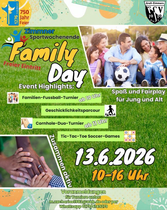 Auf dem Gelände des Turnvereins präsentieren sich die Abteilungen mit ihren Angeboten - zum Anschauen und Mitmachen. Für das leibliche Wohl ist ebenfalls gesorgt. Am Nachmittag findet die Ehrung der Meister der Gemeinde Groß-Zimmern statt. Weitere Informationen folgen.
