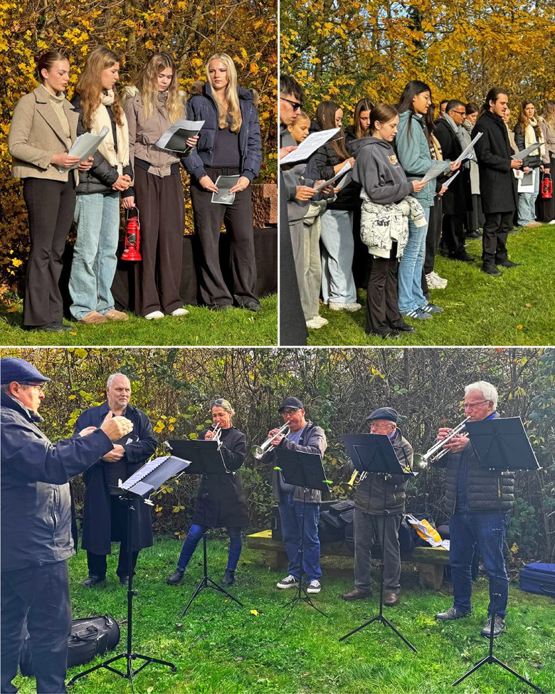 Im Anschluss trugen Schülerinnen der Albert-Schweitzer-Schule Gedichte vor. Der evangelische Posaunenchor setzte anschließend einen weiteren musikalischen Akzent. Landrat Klaus Peter Schellhaas erinnerte in seiner Rede an die Verantwortung, die aus der Geschichte erwächst, und wie wichtig es ist, Frieden und Demokratie aktiv zu schützen. Ein weiterer musikalischer Beitrag des Kirchenchors leitete zur Ansprache von Pfarrer Fornoff und dem Gebet, vorgetragen durch die Konfirmanten, über. In seiner Ansprache hob Pfarrer Fornoff die Gruppe hervor, die auch in diesem Jahr das Friedenslicht aus Verdun nach Groß-Zimmern brachte: ein symbolischer Friedenslichtbrauch, bei dem jedes Jahr eine Flamme aus Verdun an verschiedene Orte gebracht wird, um an die Schrecken des Ersten Weltkriegs zu erinnern und den Frieden zu fördern. Der Posaunenchor rundete mit einem weiteren Beitrag den musikalischen Rahmen ab.