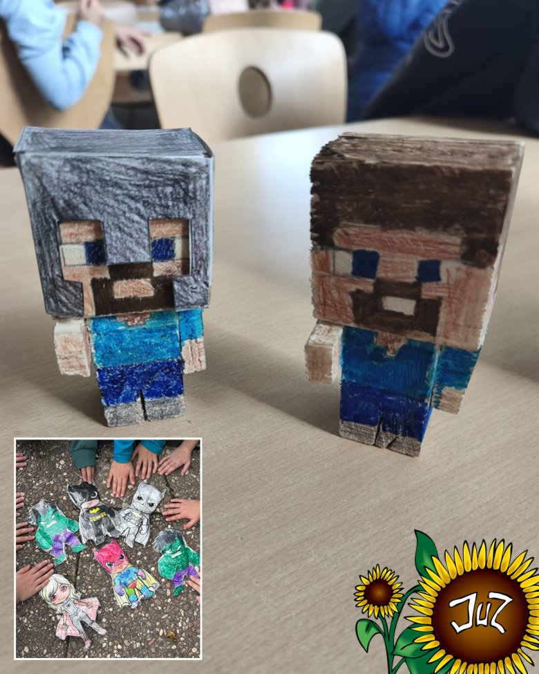 Ein weiteres Highlight war das Bastelangebot in der Werkstatt des Jugendzentrums. Ausgestattet mit Werkbänken und einer Vielzahl an Werkzeugen konnten die Kinder dort ihrer Kreativität freien Lauf lassen. Unter Anleitung entstanden phantasievolle Helden-Marionetten, selbst entworfene Figuren aus Holz und Würfeln, die von der Welt des Mincraft-Computerspiels beeinflusst waren, sowie viele ganz individuelle Bastelideen. Besonders beeindruckend war, wie begeistert die Kinder ihre Vorstellungen mit den eigenen Händen umsetzten und dabei neue handwerkliche Fähigkeiten ausprobierten.
